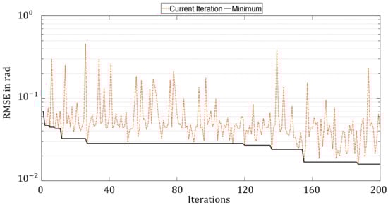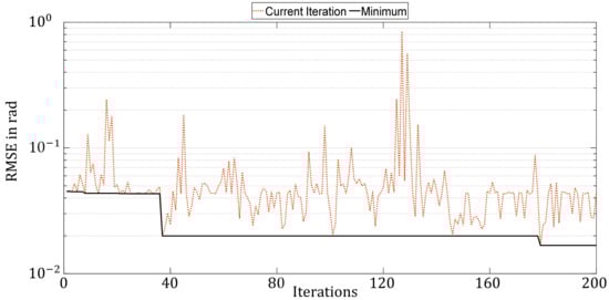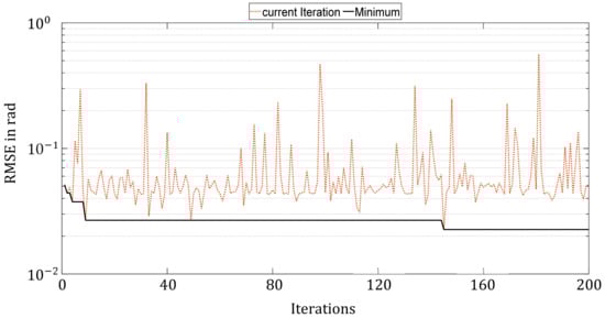 For the RS, hyperparameter sets are generated randomly in the entire search space and successively evaluated using the cost function. The parameters are uniformly distributed over the entire parameter space, which is discretized in terms of step sizes in Table 4. A total of 200 parameter sets were generated and evaluated. Figure 7 shows the progress of the hyperparameter optimization by the Random Search. The RMSE of the hyperparameter configuration evaluated in the current iteration is drawn in dotted orange. The best RMSE found up to the current iteration is represented by the solid black line. The y-axis is on a logarithmic scale.