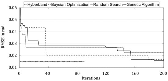 It can be seen that the RMSE tended to decrease with a continuous iteration number, although upward swings could be seen again and again. This can be observed in particular between the iterations 120 and 140. In contrast to the Random Search and Hyperband approaches, however, a clear trend can be seen.