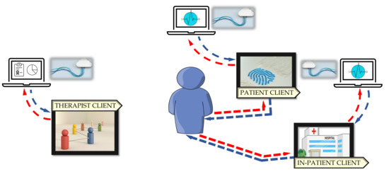 Figure 2 shows the patient–viewpoint architecture. On the basis of the patient’s observations, the multidimensional team updates the individual care plan consisting of an appropriate program of prescribed activities. Through the cloud, the Patient Client receives the assigned scheduling of exergames, either in the hospital or at the patient’s home. All data and signals are collected and accessible to clinical staff through the Therapist Client to acquire feedback on activity performance.