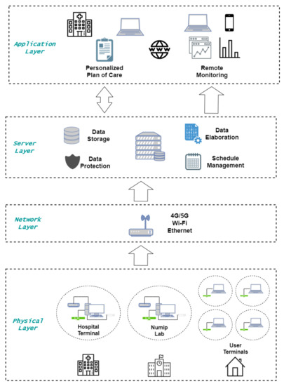 Finally, the application layer includes the therapist client, who provides the medical staff with all the necessary information on the patients being followed, displaying their performance in graphical mode and verifying their current treatment plan.