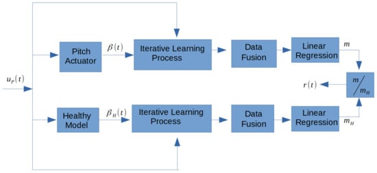 Moreover, the data sensor has been useful to detect possible failures in the pitch actuator systems of wind turbines [13,14,15,16]. Furthermore, it turns out that a parameterized plant modeling can be a key factor for efficient fault diagnosis based on the fusion of sensor data. If in addition, only a single sensor is used for the data fusion process, an option to generate data to be merged is through an iterative process. On the other hand, it is well known that the iterative learning process can improve your performance on repetitive tasks in a finite period of time [17,18,19]. Therefore, the main objective of this article is to develop a fusion of a sensor data based on adaptive iterative learning. This process will provide data in each periodic cycle task that will be further analyzed for fault diagnosis in the wind turbine pitch actuators.