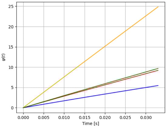 For reference, the following color labeling is used: (H) blue, () red, () orange, and () green. By using the pitch command signal given in Figure 2, Figure 3 and Figure 4 show the results of the simulation of the proposed scheme. Then, in all simulations, additive noise is attached to the pitch command signal for the robustness analysis of the proposed method. Table 4 shows the obtained regression parameters, where in the three faulty scenarios parameter r is greater than 1 and the detection algorithm works. Moreover, Figure 4 pictures data fusion variable (4), and again the fault detection is illustrated.