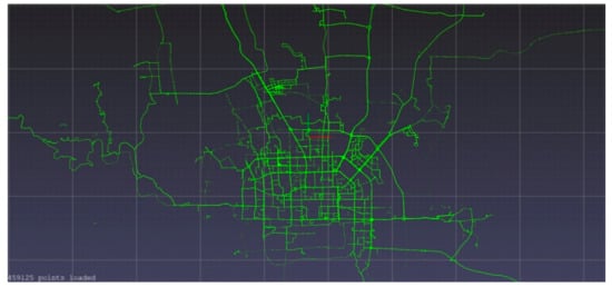 In this paper, the GeoLife GPS Trajectories [9,10,11] dataset is used. While this dataset contains trajectory information for many different forms of transportation (e.g., walking, flying, boating, taxiing), mainly around the city of Beijing, China, only the car trajectories were used (depicted in Figure 1). The raw datafile has multidimensional information, such as date and time, latitude and longitude positions, and user number. The first preprocessing step was to separate distinct journeys by using the time stamps. The raw datafile contains assembled ordered trajectories, and as the “trajectories were recorded in a dense representation of every 1–5 s”, the end of one journey is determined when the following timestamp occurred more than 300 s later. In other words, if data are not collected for more than 5 min, it is deemed a sufficiently long stoppage time for considering it a new journey.