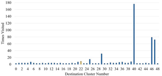 To allow for the predictability of a destination, any cluster that is only visited once or twice is removed, eventually reducing the number of possible destinations to 49 clusters. Figure 2 shows the data split with the number of times a destination is visited. D40 (D stands for Destination) was the most frequent, followed by D46 and D47, which have in comparison almost 100 less visits each.