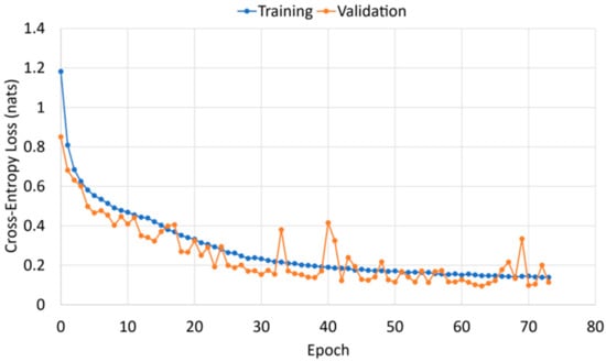 Through empirical tuning, the optimizer “Adam” is used with a learning rate set to 0.001, and a small batch size of 32 is used. To limit the likelihood of a model overfitting to the training dataset, early stopping and model checkpoints are used to save the model with the lowest validation loss score. If after 10 consecutive epochs the validation loss score does not reduce, training stops, as shown by the training curve in Figure 3. This loss was calculated by TensorFlow using the loss function sparse categorical cross-entropy. The validation loss score is calculated at the end of each epoch and used to adjust network weights.