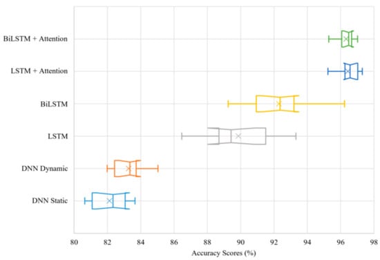 Figure 4 shows the accuracy scores for all the models studied (Section 4.3), and the average performance scores are summarized in Table 4. In Figure 4, each boxplot corresponds to the results obtained from the model indicated in the Y-axis. The X-axis represents the accuracy in percentage. Both mean and median are demonstrated in the boxplots. The length of the whiskers is computed by using the lowest and highest model performance results. The notches represent the 95% confidence intervals. Each model result includes ten individual training–testing runs. The exclusive method has been used for the calculation of the interquartile range.