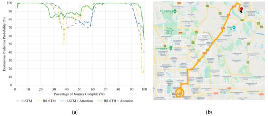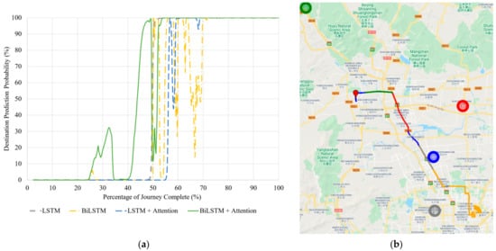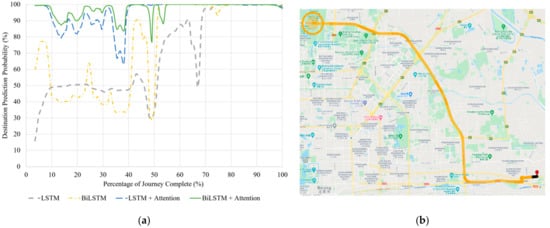 Based on all the results of each test, the BiLSTM with Attention model consistently shows the highest performance against the test set, demonstrating high accuracy and prediction stability against the test journeys. Although the BiLSTM achieves higher performance scores than the LSTM model against the shuffled test set, the independent journey tests show that their performance is very similar. While there is no significant performance difference between the two models with the attention mechanism against the shuffled test set (Figure 4), the higher certainty, prediction stability, and the earlier correct destination prediction from the unseen journey test (Figure 5a and Table 7) suffice to demonstrate that the BiLSTM with Attention model is most adequate in this case for destination prediction.