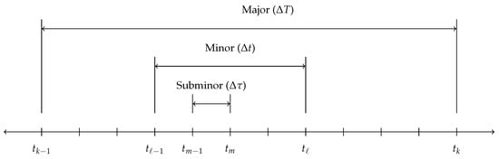 where and are the true and estimated accumulated velocity vector over the major interval, respectively. By the definition of the incremental velocity accumulation in Equation (9) and the definition of the incremental angle accumulation in Equation (6), it is clear from Equation (25) that the error in each accumulated error is expressed as a sum over all minor interval incremental velocity and angle errors such that