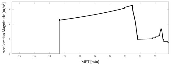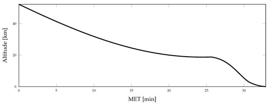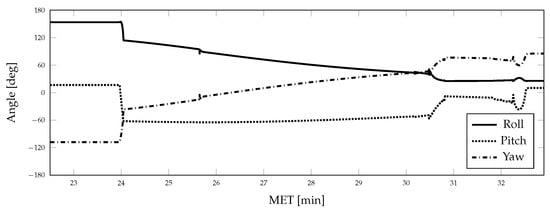 Aspects of the true vehicle trajectory are illustrated in Figure 2, Figure 3 and Figure 4. The altitude profile of the vehicle across the mission is shown in Figure 2, where the trajectory is initialized 50 km above the lunar surface. The vehicle slowly descends over the first 24 min to an altitude of 16.5 km and enters a powered descent phase after 25.5 min of mission elapsed time (MET). During powered descent, the vehicle rapidly descends to the surface in just under 7 min. Figure 3 shows the vehicle attitude, expressed as Euler angles; the attitude profile is only provided for a portion of the mission to show the changes experienced throughout the powered descent phase of the simulation. A large attitude maneuver occurs at approximately 24 min MET, as can be seen in Figure 3 and Figure 4, while a smaller attitude maneuver occurs at roughly 25.5 min MET, coinciding with the start of the powered descent phase. During the powered descent phase, the vehicle performs a translational maneuver to decelerate and land the vehicle, as seen in Figure 5. As the simulation ends and the vehicle approaches its landing location, several small attitude correction maneuvers are also performed.