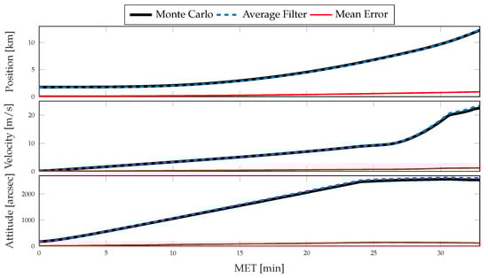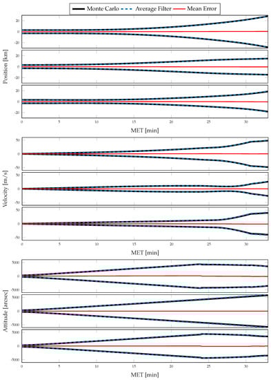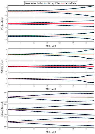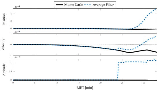 which is the squared Mahalanobis distance for trial i of the estimation error, , with respect to the filter covariance, , averaged over the number of states, n, and the number of Monte Carlo trials, M. The ANEES measure is -distributed if the estimation errors are Gaussian-distributed and allows the filter to be rejected as credible at a particular level, , should a credibility interval be breached for a significant amount of time. The credibility interval is constructed such that for and , where is a -distribution of degrees of freedom [40]. The interval contains 95% of the probability mass for the distribution having a mean of one and degrees of freedom when . The lower bound a separates the lower of the probability mass, while the upper bound eliminates the upper . If , the ANEES is perfectly consistent with the error distribution. It is necessary to note that ANEES is not a credibility measure but is useful in recognizing if the filter’s approximation of the uncertainty is representative of the errors or that the filter is consistent [41]. Finally, this measure allows the recognition of estimation performance; the estimator overestimates the estimation error when the ANEES is less than one and underestimates the error when the ANEES is greater than one. While examining the consistency of the diagonal elements of the filter and Monte Carlo sample covariance matrices is useful, ANEES allows the direct comparison of cross-correlation terms in the covariance structure to the estimation errors. Figure 10 shows the ANEES for position, velocity, and attitude for both configurations and allows the assessment that each estimator has approximately the same level of credibility for the estimation of those states. While no significant difference manifests, notice that a slight deviation occurs in the position ANEES around 28 min MET, though no significant difference is noticed in the consistency of the estimators.