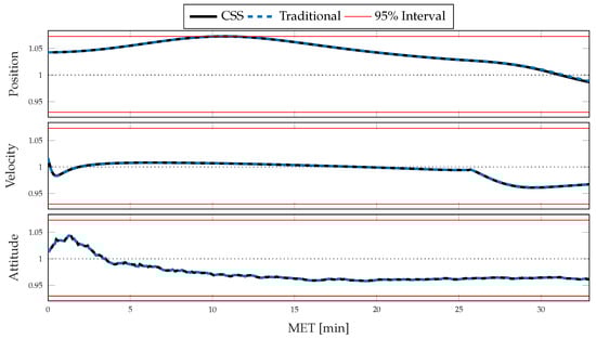 between the CSS and traditional configurations for a state x, such as position, velocity, or attitude. By this measure, if the value is less than zero, the CSS methods predict or observe a smaller spread in the distribution than the traditional methods and a larger spread if it is greater than zero. Even though the differences are small, several comments can be made when comparing system performance. By recognizing that the ratios of Monte Carlo sample standard deviations are less than zero for the velocity and position distributions and that the mean error is consistent between the two configurations, as recognized by comparing Figure 7 and Figure 9, it is concluded that the application of the CSS algorithms successfully reduces the error present in the system. The same trend is followed by the averaged filter ratio until approximately 24 min MET, when the attitude maneuver occurs. After the attitude maneuver, the vehicle begins the powered-descent phase, and a continued divergence between the ratios is observed. It is therefore clear that the introduction of these algorithms allows for a slightly more conservative representation of the uncertainty during maneuvers, while simultaneously producing a smaller spread in the estimation errors. A caveat to the analysis is that the sample size of 500 Monte Carlo trials is likely somewhat under-sampled, and the significance of the findings made by examining the ratios is difficult to justify as the differences are relatively small.