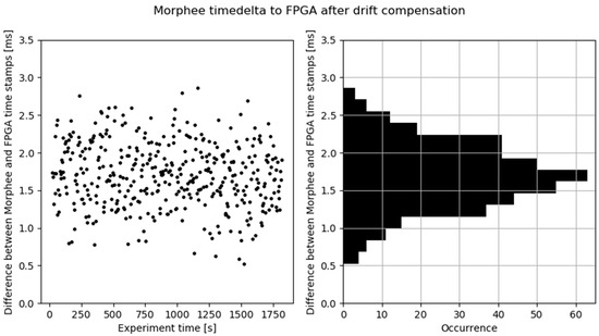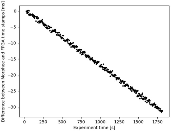 The first detection event stored in the log was used to synchronize Morphee and FPGA time. The full experiment captured 408 events. Figure 8 shows an unexpected result, the Morphee stamps are ahead of FPGA clock time. This situation should be the opposite, considering that data has to be sent over FDX communication after detection and then logged by the Morphee environment. The reason for such a situation is the time drift, which exists between the reference and the Morphee clock. The difference starts from zero due to the synchronization and accumulates continuously throughout the experiment reaching around 31 milliseconds at the end of the test loop. The time drift calculated out of these data is 1.056 ms per minute. Figure 9 depicts the same experimental results but after compensating for the clock drift.