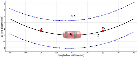 where = curvature parameters (1) for left and right line [m], = middle of lane for z = 0 m, , = destination point lateral distance for left and right line [m].