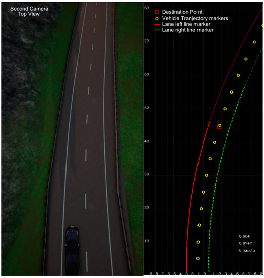 For the purpose of the experiment and measurements, the work of LKA is drawn in an additional window which allows for comparing the CARLA top road view (Figure 12 left) with the result of line detection (Figure 12, right). The LKA window includes both road lines detections (red and green) and the estimated vehicle trajectory (yellow dots), based on the destination point. This is the trajectory for the vehicle to follow. Additionally, each line model indicates a valid range by color intensity change. The red circle is the destination point estimated from the lane model. Figure 13 represents the Mobileye view of the same scene.