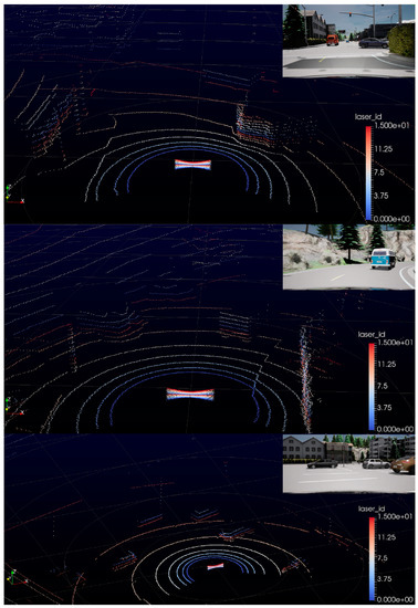 Velodyne lidar simulation is verified on VeloView software which is the lidar manufacturer’s own data cloud visualization tool. We input the simulated data into the VeloView to confirm the basic functionality of the simulated lidar against specific CARLA scenes. Simulation mimics communication protocol and sensor point cloud. A few examples from the VeloView tool are shown in Figure 15. Examples also include a camera view from the same point in time.
