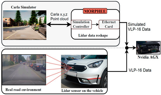 Following this, we wish to verify the feasibility of free space detection on simulated lidar data. To that end, we utilized the very same Nvidia AGX hardware. Figure 18 provides a scheme, which explains how the simulation replaces a real sensor data input into the AGX system.