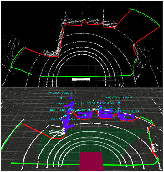 The lidar point cloud is drawn in form of white points (the points are large, therefore they may give the impression of lines in Figure 17). Most important are the green contour and the red line that correspond to the free and occupied space in front of the car. Figure 16 illustrates a parking scene, where four cars are parked in the lidar view. On the basis of the lidar data, the algorithm is, therefore, able to define what part of space in front is drivable. Each object which is higher than a few centimeters is treated as an obstacle, which should not be hit or crossed by the vehicle.