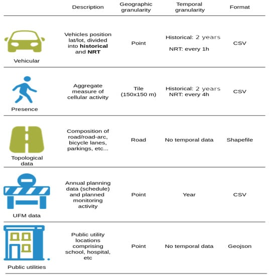 The data sources introduced in Section 3 are subject to different processing pipelines due to the inherent syntactic and semantic differences that they embody. Concerning the vehicular and presence data, of relevance to the UFM process is the measure of the activity level inside a particular area in time. To this end, both pipelines are finalized to implement a counting technique measuring the activity volume. The geographical granularity of the presence data is accounted on a tile basis, a square-shaped geographical covering an area of 150 m × 150 m, while the vehicular data are point data—latitude and longitude—and can be accounted for at any meaningful granularity. These data resolutions are imposed by the data provider. It is important to note that in scenarios where both vehicular and presence data need to be accounted for, the granularity of this aggregation operation can be a tile or a multiple of tile entities.