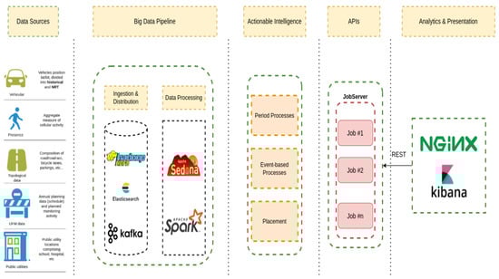 Once the data have been processed, they are stored in Elasticsearch, a fast and scalable no-SQL database with advanced capabilities of indexing and querying key-value data [24]. Thanks to the advanced integration between Spark and Elasticsearch, we can use the solution as both a data provider and as a distributed storage system. The data are subject to further refinements and algorithmic processes aimed at creating different layers of aggregations, calculating synthetic indexes, etc., which are then used by the planner functionality to identify suitable time intervals during which to schedule urban operations. The raw data and information extracted from the data are presented to the end-users in different forms through advanced visualization dashboards available through Kibana, part of the Elasticsearch ecosystem. Last is the JobServer component, an optimized RESTful interface for submitting and managing Apache Spark tasks [25]. A job request, e.g., for a suggestion on a maintenance operation schedule, is a JSON-formatted request, triggering the execution of a specific algorithm resulting in a JSON-formatted output visualized through a web-based user interface. This component composes part of the IPPODAMO programmatic API, which could be used to integrate the solution into a larger, federated ecosystem of platforms in a smart city context.