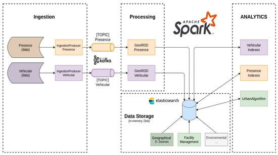 Referring to Figure 3, both vehicular and presence data sources are initially subjected to some syntactic transformations before being forwarded from the Kafka producer, simplifying the ingestion process on the Spark cluster. From here on, the data are subject to semantic transformation processes, enriching the source data with relevant geographical information. In particular, the last operation in the pipeline accounts for the activity index information, retaining it in a distributed memory support. This operation should be done in a fast and efficient way; otherwise, it risks becoming a bottleneck for the overall system, delaying the ingestion performance.