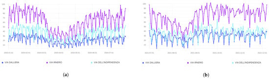 Trend of the vehicular index—scale [0, 100] for better visualization—in the pre-COVID-19, during and post-COVID-19 period. (a) Timeline comprising the COVID-19 period. (b) Post-COVID-19 period.