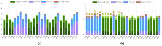 The UFM scheduler result, providing the operator with potential timeframes (green color) during which to schedule a specific maintenance operation. The final activity index is decomposed in all its constituent values, contributing to the final index. The analysis considers a period of one month, starting from 10 November 2021. (a) Equal cost timeframes proposed by the scheduler for a maintenance operation in Via Indipendenza X, Bologna, Italy. (b) Identified non-binding interference for a maintenance operation in Via Zamboni, Bologna, Italy, in the interval [10, 23]. (c) Equal cost timeframes, vehicular data only, proposed by the scheduler for a maintenance operation in Via Zamboni. (d) Scheduling of an urgent intervention in Via Zamboni, relying on the next-day prediction of the activity index.