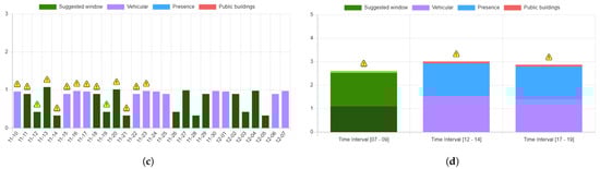 Figure 6 shows some sample outputs generated by the UFM scheduler functionality provisioned in the second use case. For this assessment, the algorithm relies on the predictive index and co-locality information identifying nearby interferences, e.g., city events, other public utility maintenance operations announced by the municipality, etc. A maintenance operation has a specific location in space, and a duration in time that could span several days or hours (Figure 6). Indeed, as already discussed, the data are sliced in the time domain: in Figure 6a, the algorithm exploits the daily predictive index to position a maintenance operation in time, while, in Figure 6d, the maintenance operation is, generally, positioned in a series of consecutive (pre-configured) time intervals. The IPPODAMO interface allows an operator to specify this additional search criterion.