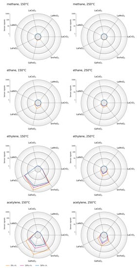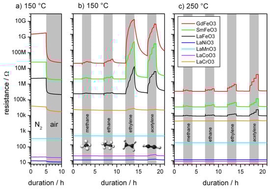 - Alharbi, A.A.; Sackmann, A.; Weimar, U.; Barsan, N. Acetylene-and Ethylene-Sensing Mechanism for LaFeO3-Based Gas Sensors: Operando Insights. J. Phys. Chem. C 2020, 124, 7317–7326. [Google Scholar] [CrossRef]