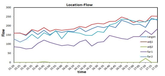 Recently, the Graph Convolutional Neural Network (GCN) has become the most popular topic in traffic prediction problems [12,13]. Unlike traditional data-driven methods, graph neural networks can process non-Euclidean data and capture road topology information. Compared with other methods, the training speed is faster, and the parameters are also reduced. As shown in Figure 1, a road network is formed at the intersection. When congestion occurs in one section, its adjacent road sections will be significantly affected and spread to other road sections within a certain period. Taking node 1 as the target node, when the traffic jam occurs at node 1, the correlation at neighboring node 2 is strong, while the correlation at adjacent node 5 is weak. Compared with distant node 3 and node 4, they all have a specific correlation. Therefore, it can be seen that the network space correlation between traffic sections is quite complicated. The traffic conditions between two road sections with similar geographical locations may not be correlated, but the traffic conditions between two road sections with a longer distance can be connected. In addition, there is also a specific non-linear correlation between different time observations. Different observations of the same node at different times, such as an hour ago, a day ago, or even one week ago, are correlated to the measured points. To do this, we must incorporate this information into the model to make accurate traffic predictions. Figure 2 is an example of simulated road flow correlation.