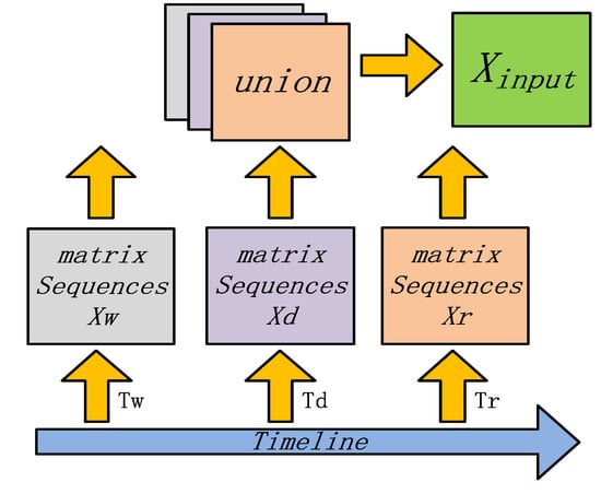 where d and w represent the number of time slices in the daily and weekly time periods (for example, in a 1-h time period, d = 24 and w = 24 × 7), and , , and are 3, 1, and 1. The model input is shown in Figure 4.