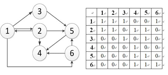 - Traffic Adjacency GraphThis article defines the traffic adjacency graph () based on the spatial proximity, whether there is a straight line between each pair of nodes (,), sand if and are connected, then . Otherwise, . The adjacency graph is calculated as follows:Figure 5 shows an example of the adjacency matrix: