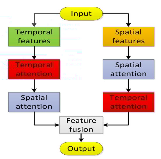 Here, , its superscript θ carries spatial correlation information and the subscript t-τ carries temporal correlation information. To feature the fusion of spatio-temporal information, we use a spatio-temporal attention mechanism in two steps, as shown in Figure 7.