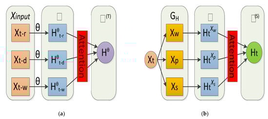 In the first step, we divide the spatio-temporal representation into two expression forms: (1) according to the same temporal but different spatial locations into , , and ; (2) according to the same spatial but different temporal information into . The former represents the spatial features of heterogeneous multi-graphs and is called spatial attention; the latter represents multi-level temporal features and is called temporal attention. Therefore, the spatial attention (Equation (14)) and temporal attention (Equation (15)) of the first step are as follows: