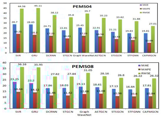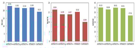 This paper compares eight baseline models with our model. It can be seen, from Figure 9, that our CAFMGCN model has achieved the best results compared with other models on the three evaluation indicators of MAE, MAPE, and RMSE. The traditional time series methods SVR and GRU only consider temporal correlation, ignoring the importance of spatial correlation, so the prediction effect is not ideal. Based on deep learning methods, DCRNN, STGCN, Graph WaveNet, ASTGCN, STSGCN, STFGNN, and our model, CAFMGCN, graph structure and graph topology is introduce to capture spatial information and achieve better prediction results. Graph WaveNet has the worst prediction effect because it only uses 1D CNN and cannot stack its spatio-temporal layers and expand the receptive field. DCRNN, STGCN, and ASTGCN, respectively, use two modules to deal with temporal and spatial correlations, ignoring the heterogeneity of spatio-temporal data, and the prediction effect is average. However, STSGCN and STFGNN simultaneously process temporal and spatial correlation, with higher MAE, MAPE, and RMSE, but ignore temporal diversity. Our CAFMGCN considers the diverse temporal and heterogeneous spatial correlations and, simultaneously, captures spatio-temporal correlations and performs multi-graph fusion. The experimental results show that CAFMGCN can better capture the heterogeneous spatio-temporal correlation of the road network, thus achieving the best prediction effect.