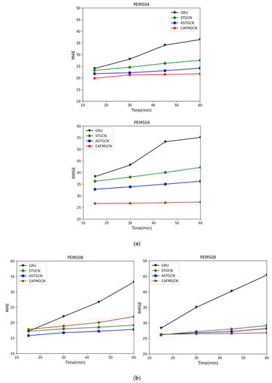 Figure 10 shows the traffic flow forecasts for the next 15, 30, 45, and 60 min of the two data sets. Taking GRU, STGCN, and ASTGCN as the baseline, it can be seen from the figure that, as time increases, each model’s prediction shows an upward trend, but the prediction error of our model rises more slowly than the other three models, because we consider the long-distance time correlation and combine the features of multi-graphs to reduce the model’s prediction error. Effective forecasting results have been achieved in the short term, and are very helpful for long-term forecasting.