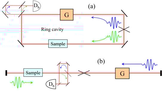 Idealized design of an intracavity phase interferometer, in a ring (a) or linear (b) configuration. Two pulses (green and blue) are circulated in the cavity. Sample is a device that produces, at each round-trip, a differential phase shift between the two pulses that is proportional to the quantity to be measured. This phase difference results in an optical frequency difference. The latter is measured as a beat note between the two output combs made to interfere via an optical delay line on a detector . G is the gain element.