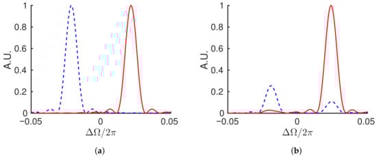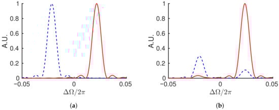 Figure 2 shows a pair of teeth of the two frequency combs corresponding to the fields numerically solved from Equation (7). The system of Equation (9) are first solved for in the time domain and then the Fourier transform of the resultant pulse train is taken to obtain the frequency comb. The angular frequency variable, , is the departure from an average optical angular frequency, , such that the differential phase causes a splitting centered at . The simulation used a detuning of , gain of , , and in Equation (8), and the temporal dimensions are scaled by the round-trip time (). Figure 2a shows the result without coupling, , while Figure 2b shows what happens when a coupling of is included. Since , the peaks are spaced by in frequency space. However, when the electric fields are interfered, the system with coupling will read out a distorted beat frequency that is not necessarily equal to the mode spacing.