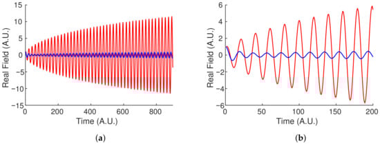 Numerical solution showing a pair of teeth of the two frequency combs (red, blue) defined by the time model of Equation (7) after 100 round-trips with no coupling, (a), and coupling, (b). Both simulations were carried out with a detuning of , gain of , , and in Equation (8), and . When coupling is included, the fields pass energy back and forth such that which field is dominant in plot (b) depends on how many round-trips are considered If taken over an infinite number of round-trips, (b) and Figure 4b would be symmetric, since the amplitudes of the two pulses follow similar oscillation, but out of phase. Since the variable x is in fact the time (in unit of round-trip), (b) and Figure 4b can be recognized as wavelet transforms.