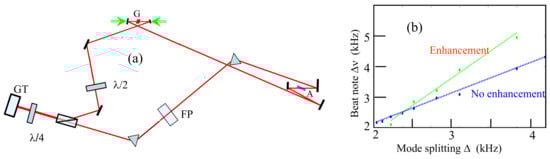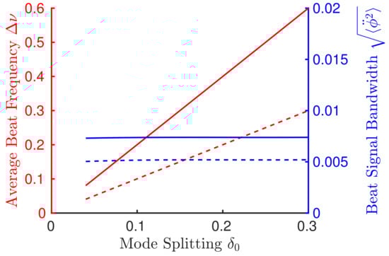 Figure 5 shows the enhanced (solid) and non-enhanced (dashed) sensor response curve and beat signal bandwidth. The average beat frequency (red, left axis) is plotted as a function of mode splitting according to Equation (33). The enhancement is clear as the slope of the lines correspond to the enhancement factor . The beat signal bandwidth (blue, right axis) is plotted according to Equation (32), implying that the noise does not diverge since the coupling has been removed, . This calculation was carried out using , with 150 round-trips, gain parameters of , , and , and an enhancement factor of .