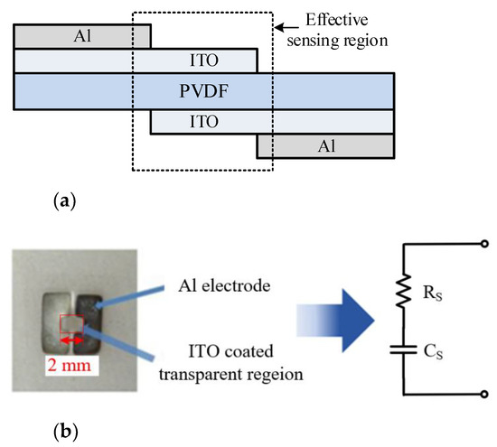 (a) Schematic diagram of the PVDF transducer; (b) photograph of the PVDF transducer and its electrical model.