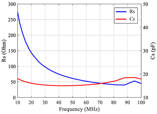 Figure 1a depicts the schematic of the ultrasound transducer, which was made of a 9-μm-thick piezoelectric material PVDF film, whose resonance frequency and bandwidth were around 50~80 MHz and 75~140 MHz, respectively [18,19,20]. The materials of the transducer electrodes were Indium Tin Oxide (ITO) and Aluminum (Al). The fabrication process was conducted as follows: (1) A 9-μm-thick polarized PVDF film was cut into pieces of suitable sizes; (2) With RF sputtering, the 200-nm-thick ITO electrodes were formed on the two surfaces of the PVDF film; (3) With DC sputtering, the aluminum electrodes were formed on the surfaces of the PVDF film. The effective sensing region was the 2 × 2 mm2 transparent area at the center. Figure 1b shows the photograph of the PVDF transducer and its electrical model. Measured with an impedance analyzer, Figure 2 presents the electrical output impedance of the transducer, where the series resistance was about 50 Ω from 50 MHz to 100 MHz and the series capacitance was close to a constant of 16 pF.
