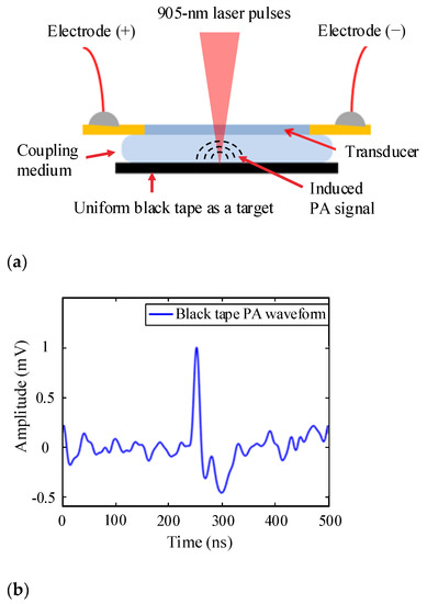 As shown in Figure 3a, to measure the photoacoustic response of the transducer, an optically absorptive target made of black tape was used. The target was put under the transducer’s effective sensing region. During the measurement, a small amount of water was added between the transducer and the target surface to improve the acoustic signal coupling efficiency. The 905-nm laser pulses (pulse width: 8 ns, pulse energy: 150 nJ/pulse, repetition rate: 1 kHz) were shot through the transducer to the target. The PA signal excited from the surface of the target was detected by the transducer. The representative PA signal recorded by the transducer is depicted in Figure 3b.