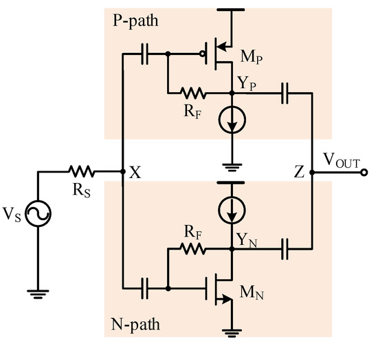 To suppress the second-order harmonics in the single-ended ultrasound LNA structure, complementary CMOS topology was investigated [17]. As depicted in Figure 7, the complementary CMOS amplifier consisted of a PMOS-based resistive shunt-feedback amplifier MP in parallel with an NMOS-based resistive shunt-feedback amplifier MN. The drain current in each sub-amplifier as a function of the input signal was respectively obtained as [22]: