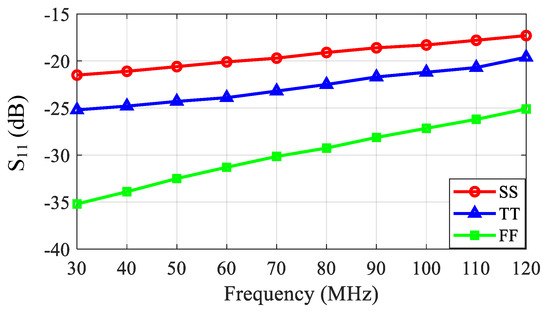 Simulated S11 of the proposed LNA, where SS, TT, and FF stand for the slow PMOS and NMOS, typical PMOS and NMOS, and fast PMOS and NMOS process corners, respectively.