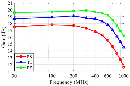 Figure 11 and Figure 12 show the simulated S11 and frequency response of the LNA, respectively. The S11 was better than −17 dB over the desired ultrasound transducer operation frequency range. The S11 at higher frequencies was slightly degraded by the main amplifier input node capacitance. The frequency response shows that the LNA had a gain of 19 dB, up to 120 MHz, in the typical corner and a f−3dB bandwidth of 770 MHz. The gain variation over the process, voltage, and temperatures (PVTs) was less than 2 dB.