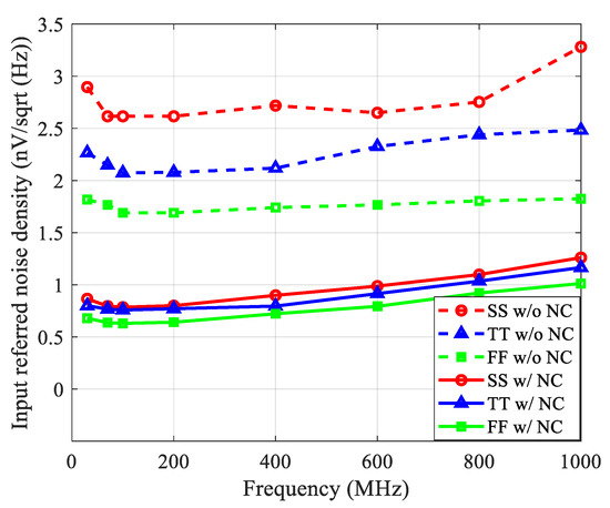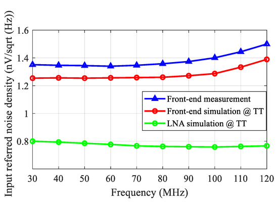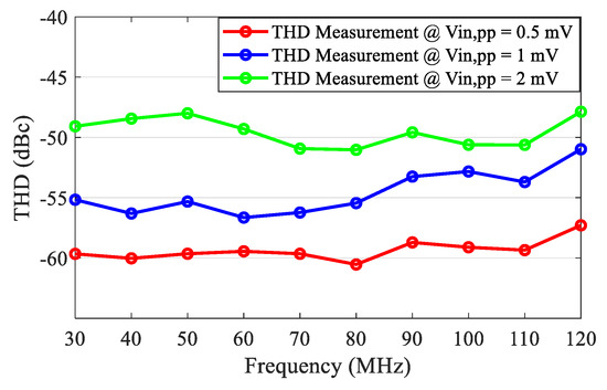 As shown in Figure 13, with feedforward noise cancellation, the amplifier input-referred voltage noise density was reduced by about 3× over PVTs. The input-referred voltage noise density was less than 0.8 nV/sqrt (Hz) over a 30–120 MHz frequency range. The THD simulation was also performed, and the simulation results are summarized in Table 1. The signal generated by the transducer was in the range of 0.5–2 mV peak-to-peak, corresponding to an input signal power of −62 dBm to −50 dBm in a 50 Ω terminated system. As shown in Table 1, the complementary CMOS topology provided a THD improvement of larger than 9 dB across the input signal range.