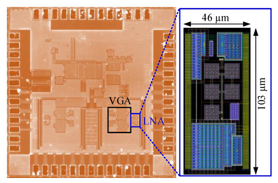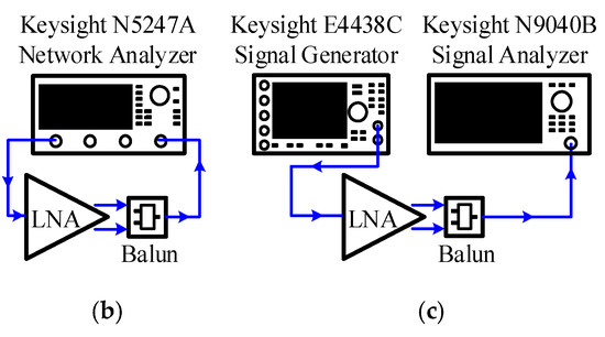 A high-frequency ultrasound and photoacoustic imaging front-end, as shown in Figure 14, including the proposed LNA and a pseudo-differential VGA, has been developed and fabricated in a one-poly six-metal (1P6M) 180 nm bulk CMOS process with a core area of 380 μm × 350 μm. The gain of the VGA is programmable, ranging from 20 to 32 dB with a 6-dB gain step. The Figure 15 shows the die photo of the front-end. Figure 16 shows the measurements setup. The S11 and frequency response were measured with the Keysight N5247A network analyzer. The noise density and the THD were measured with the Keysight E4438C signal generator and the Keysight N9040B signal analyzer.