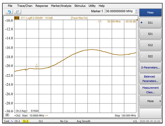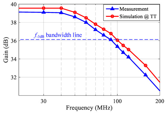 The measured S11 was better than −16 dB over the frequency range of 30–120 MHz, as shown in Figure 17. Setting the VGA with a 20 dB gain, the measured frequency response of the front-end is shown in Figure 18. Due to the bandwidth limitation of the VGA, the measured f−3dB bandwidth of the front-end was 89 MHz. The noise performance of the front-end over 30–120 MHz is shown in Figure 19. The measured input-referred noise density of the front-end was 1.36 nV/sqrt (Hz) at 80 MHz, which closely matched the simulation result of 1.26 nV/sqrt (Hz). Figure 20 shows the measured THD of the front end. With VIN, PP = 1 mV, the measured THD was better than −55 dBc over 30–80 MHz and was −51 dBc at 120 MHz.
