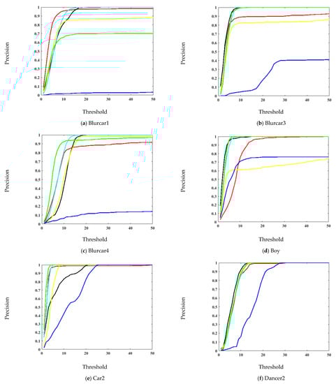 The precision and error plots are presented in Figure 6 and Figure 7, respectively. These plots provide a frame-by-frame comparison in entire image sequences. Since precision and location error gives the mean of the entire sequence, it is possible that the algorithm loses the target for a few frames but correctly tracks again. Therefore, these plots were presented to show the effectiveness of the tracking method. In the videos Blurcar1, Human7, Jogging1, and Jogging2, the proposed algorithm has the highest precision in the entire video. It has slightly low accuracy in the Blurcar3, Blurcar4, Boy, Car2, Dancer2 and Suv videos. The proposed algorithm has the lowest error in the Blurcar1, Human7, Jogging1, and Jogging2 videos. It has marginally high error compared with a few trackers for the Blurcar3, Blurcar4, Boy, Car2, Dancer2, and Suv sequences.