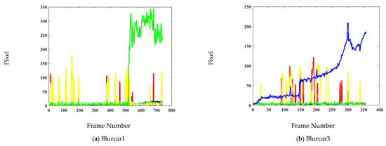 Figure 5a shows that, without both motion and blur, APCE and are high; therefore, the learning rate of tracking should be fast. However, when motion blur occurs, both APCE and give low values, as shown in Figure 5b. Thus, in that case, the model should be updated slowly due to the appearance change of the target. By using this mechanism, the proposed tracking achieved significant results for the motion blur challenge. The tracker is given in Algorithm 1.